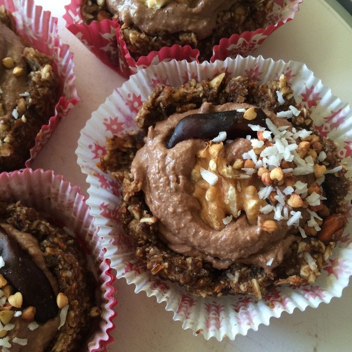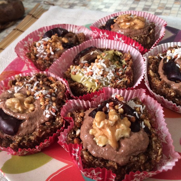 Половинка финика, кокосовая стружка, кедровые, ягоды, мята - я не указывала в ингредиентах, так как это только украшение. Да, и если что, какао всегда можно частично или полностью заменить порошком кэроба (плода рожкового дерева). Кстати, кэроб сладкий, и фиников берите в этом случае меньше.