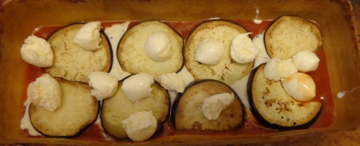 После этого фольгу снять, уложить кусочки моцареллы и подержать в духовке, пока сыр не растопится.