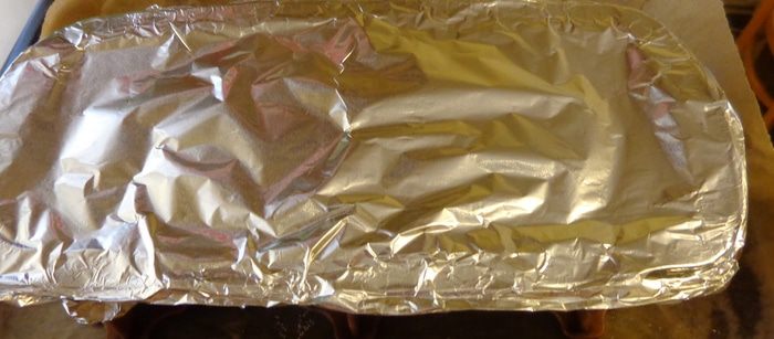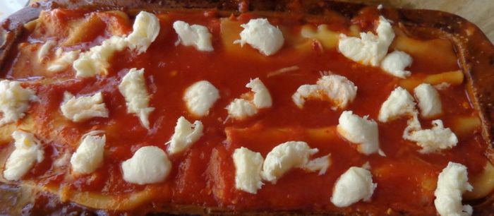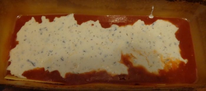 Сверху должны быть листы лазаньи, которые надо залить остатками соуса. Закрыть форму фольгой и выпекать минут 30 при 190 градусах.