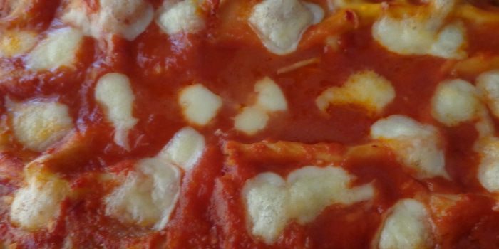 На дно формы вылить полстакана соуса и уложить на него слой листов лазаньи, на них выложить сырную смесь.
