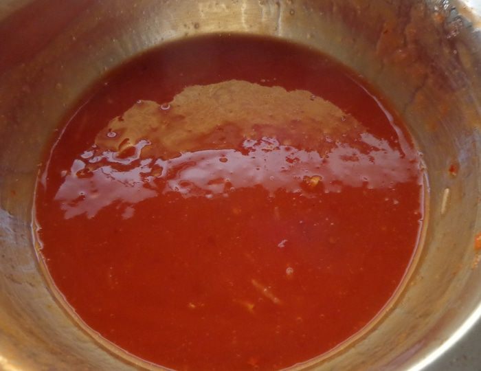 Смешать острый томатный соус с томатным соком и измельченным чесноком. При необходимости подсолить.