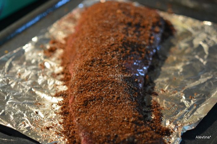 Обвалять в готовой кофейной посыпке с обеих сторон. Готовим на разогретом гриле или в духовке в режиме бройл 8-12 мин до средней прожарки.