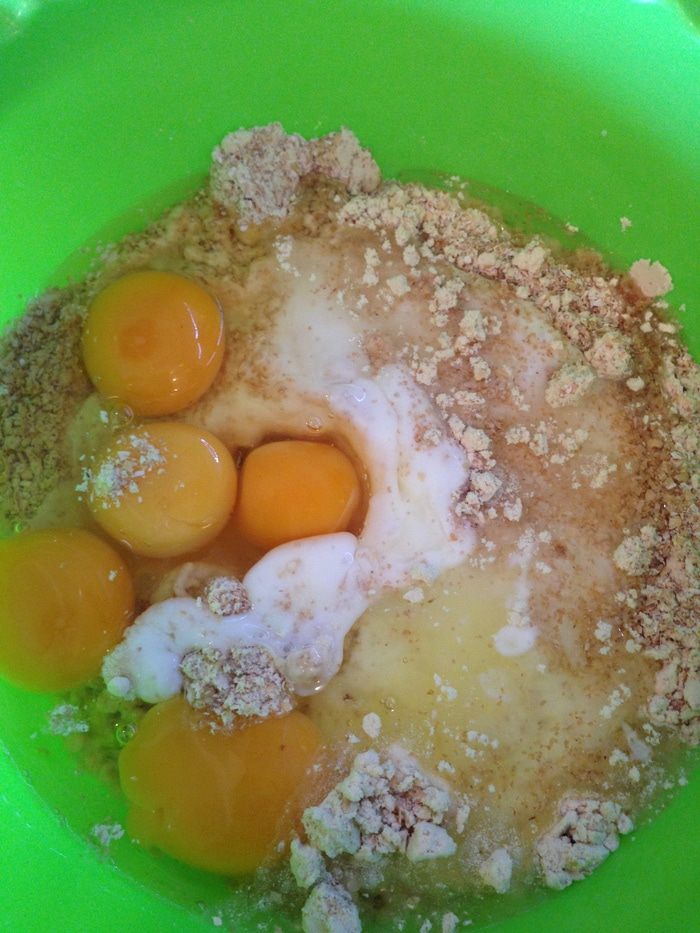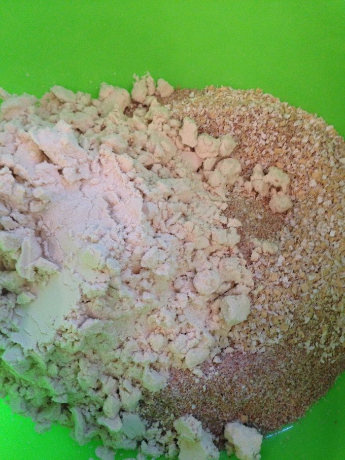 Смешать отруби с изолятом, разрыхлителем и солью.