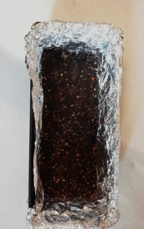 Четвертым слоем будет глазурь. Обычно этот слой я делаю из растопленного горького шоколада со сливочным маслом, но шоколада в наличии не оказалось, поэтому быстренько варим глазурь. Смешать до однородности 3 ст.л. какао, 2 ст.л. сахара, 2 ст.л. молока и 30 гр. слив. масла. Хорошо прогреть и выложить получившуюся массу на наше пирожное, разровнять. Прошу прощения за фото (фольга бликует), но, думаю, и так все понятно. Отправляем наше пирожное в морозилку еще на 30 минут.