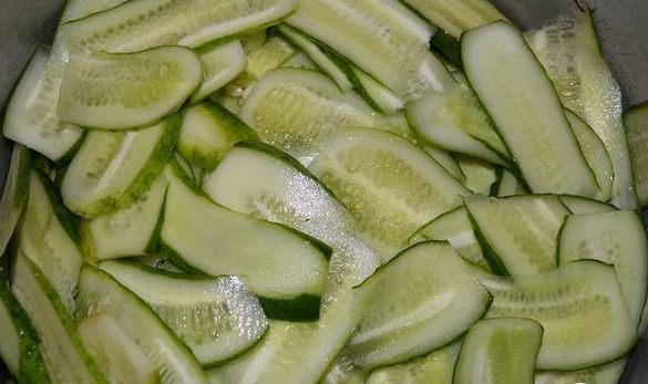Огурцы нарезать вдоль на тонкие полоски. Удобно делать овощечисткой.