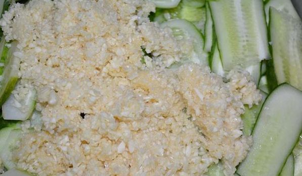 Чеснок почистить и пропустить через пресс. Я измельчила через блендер.