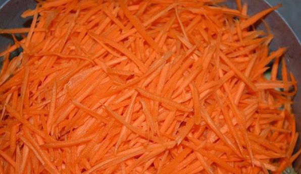 Морковь потереть на терке для корейской моркови. Все перемешать.