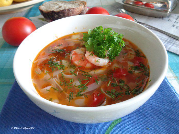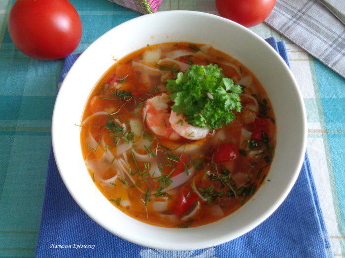 Хочу предложить вашему вниманию очень вкусный, насыщенный суп с морепродуктами и рыбой, с добавлением томатов, овощей и рисовой лапшой.
