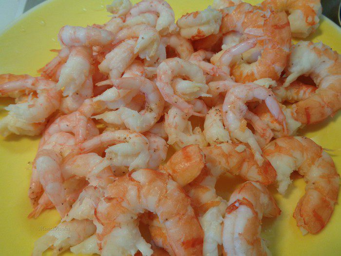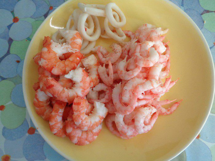 Отварить креветки и кальмары в подсоленной воде с черным перцем горошком и лавровым листиком. Остудить и очистить креветки от панциря.