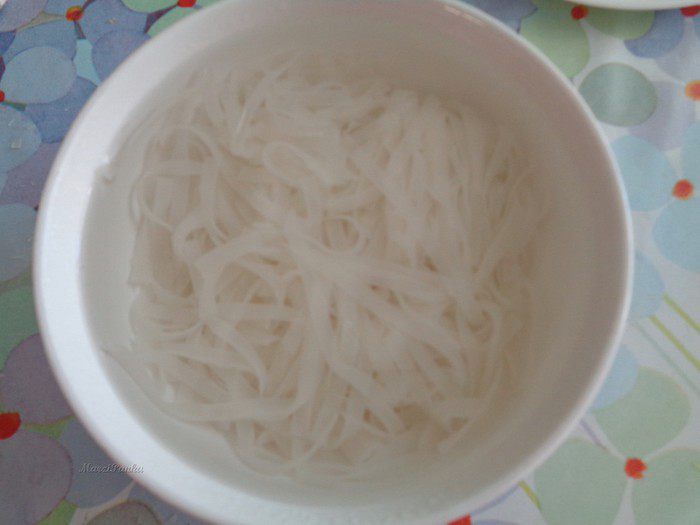 Рисовую лапшу поломать на кусочки.
