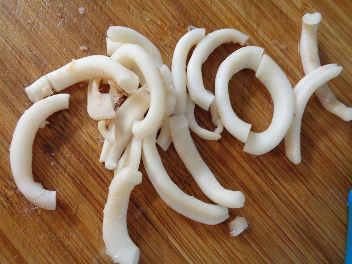 Кальмары разрезать пополам и добавить к супу.