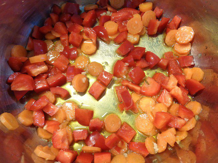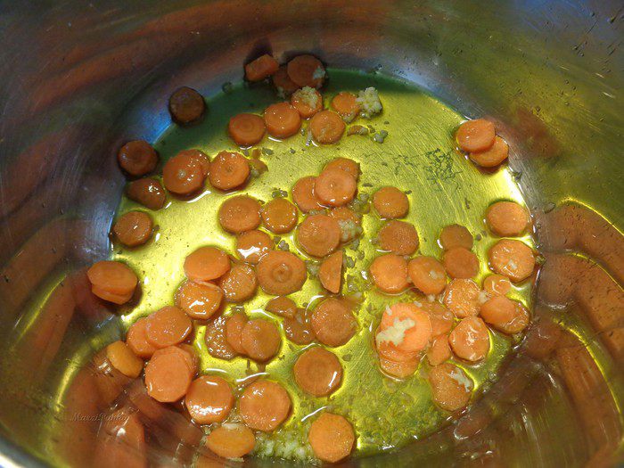 С кастрюлю, в которой будете варить суп, налить оливковое масло. В разогретое масло положить морковь и, пропущенный через пресс, чеснок.
