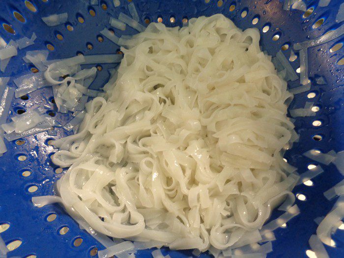 Затем слить воду и промыть лапшу в дуршлаге холодной водой.