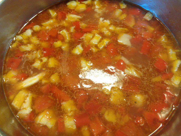 По мотивам испанской кухни. Набор продуктов произвольный, готовила не по рецепту, а по своим вкусовым предпочтениям. Если кому-то такой суп понравится и захочет повторить, буду рада. От себя могу сказать, что родные мои остались очень довольны и просили этот суп повторять. Идеальный вариант обеда.