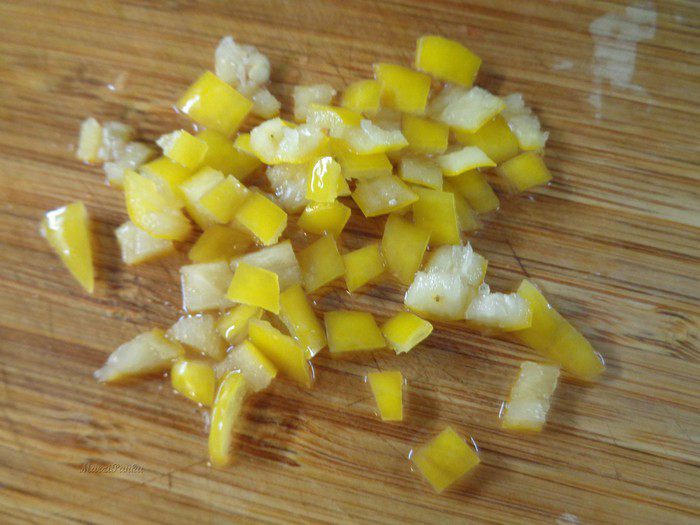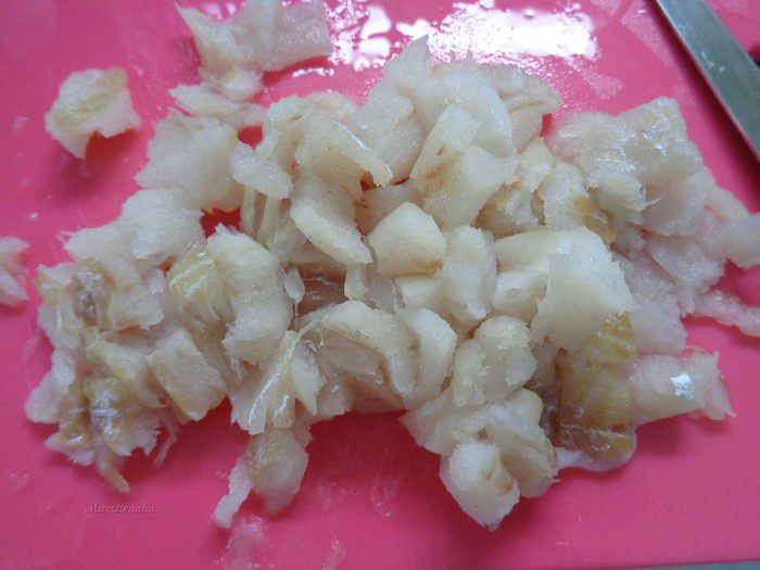 Перец чили (у меня желтый) очистить от семян и мелко порезать.