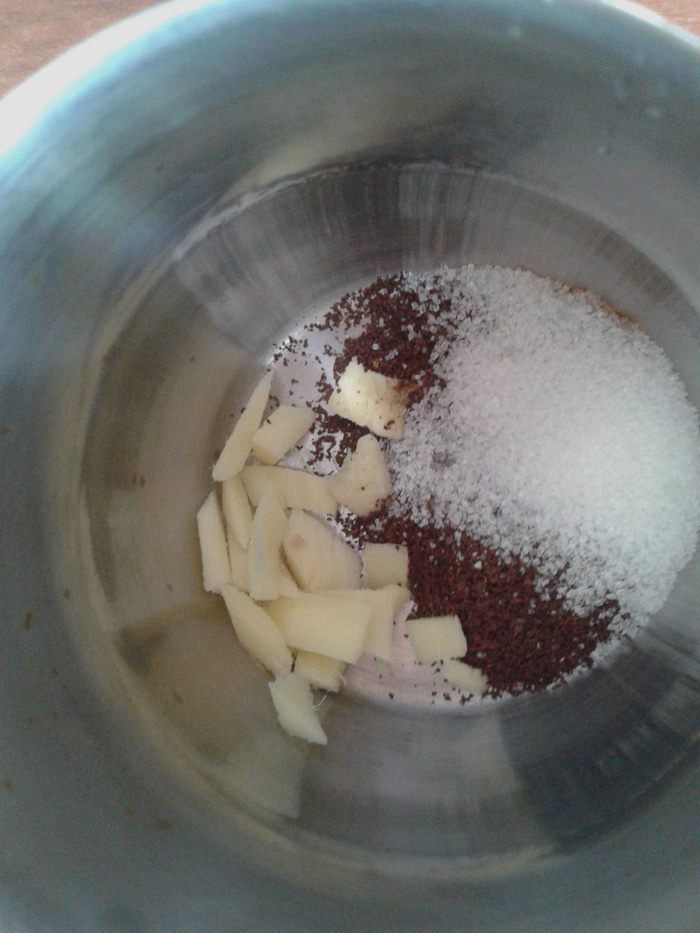 Первым делом почистим корешок имбиря и порежем его кубиками. В турку насыпаем кофе, сахар, корицу, кладем имбирь. Воду вскипятим и добавим вместе с молоком в турку.