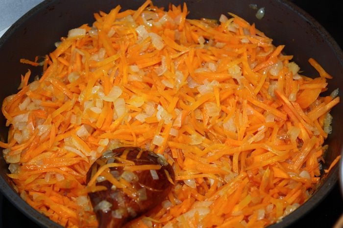 Все овощи очищаем и вымываем. Лук шинкуем на кубики одинакового размера. Морковку нарезаем соломкой. Лук пассируем в глубоком сотейнике на растительном масле до прозрачного состояния на среднем огне. Затем добавляем мёд и перемешиваем лук до тех пор, пока мёд не растворится полностью, а лук не закарамелизируется. После этого добавляем морковку и пассируем около 10 минут.
