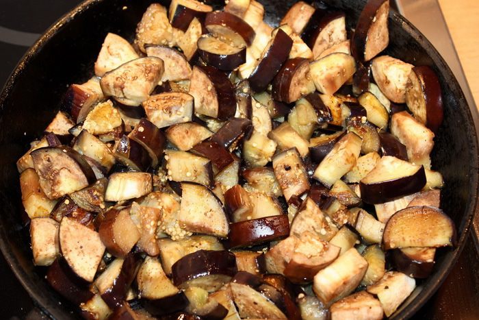 Баклажаны нарезаем крупно и обжариваем их на растительном масле. Периодически надо перемешивать, чтобы вся масса обжарилась однородно.