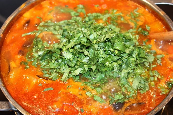 Всыпаем порубленную зелень и добавляем бальзамический уксус. Как только овощи закипели, уменьшаем огонь на самый минимум, выдерживаем 3-4 минуты в кипящем состоянии.
