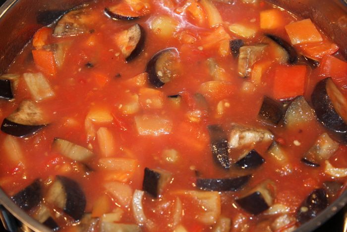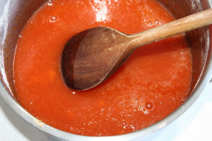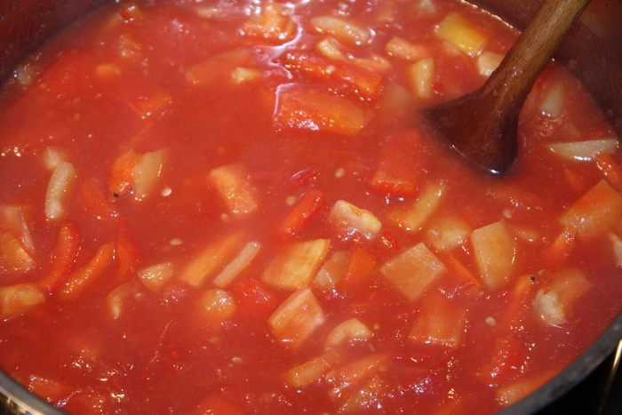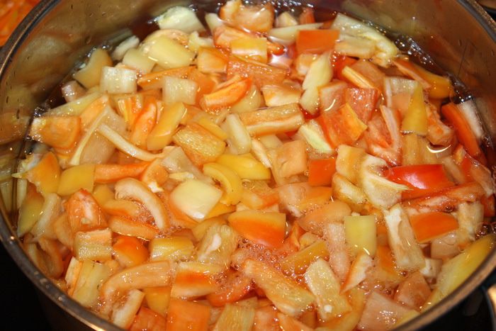 Всыпаем бланшированный перец в соус. Доводим до кипения.