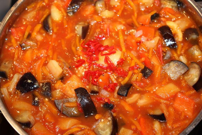 Чеснок выдавливаем через пресс для чеснока и отправляем в сотейник с овощами. Затем всыпаем соль, сахар, перец и чили перчик, все хорошо смешиваем. Тушим 20-25 минут.