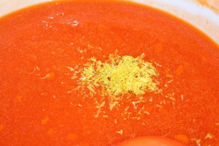 В морошковое пюре добавляем 2 кг сахара, воду и цедру лайма, доводим до кипения и варим на среднем огне постоянно, помешивая 15 минут.