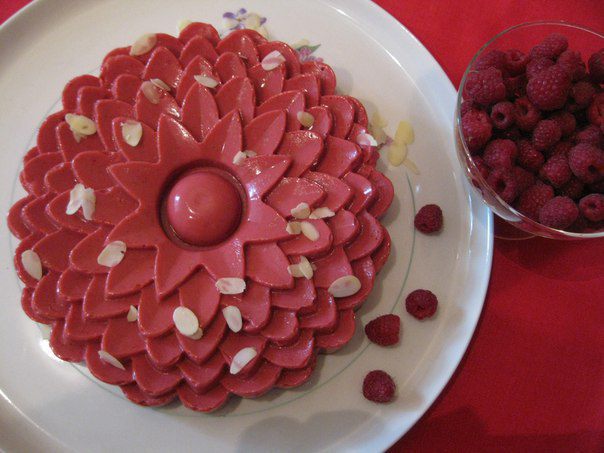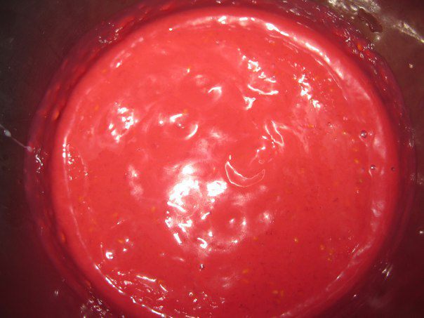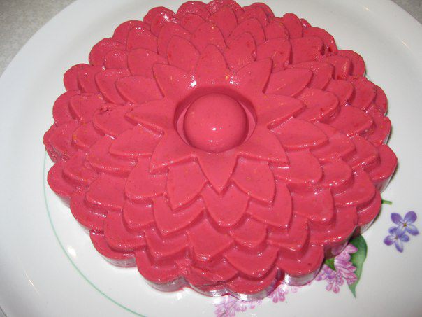 Желатин поставить на огонь и не доводить до кипения. Влить в малиновое пюре и еще раз взбить. Вылить в силиконовую форму. Поставить в холодильник на 4 часа или на ночь.