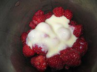 В емкость для взбивания положить малину и вылить сгущенное молоко. Все взбить.