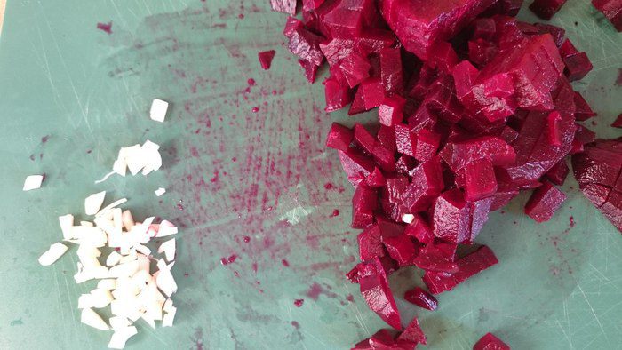 Вареную свеклу очистить, порезать на мелкие кубики, дольку чеснока измельчить.