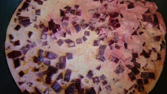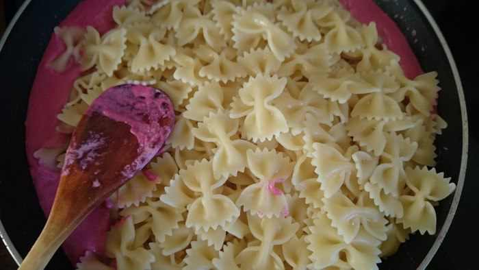 Добавить свеклу, прогреть одну минуту и добавить сливки, тушить на среднем огне 2 минуты.