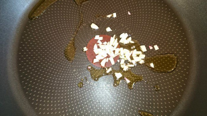 В сковороде разогреть оливковое масло, добавить чеснок, нагреть до запаха.
