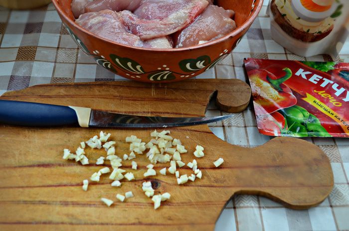 В миске смешать кетчуп, майонез, чеснок, добавить немного соли и перемешать. Положить в полученный соус филе куриных бёдрышек и оставить мариноваться минимум на 30 минут (если есть возможность, то на 2 часа).