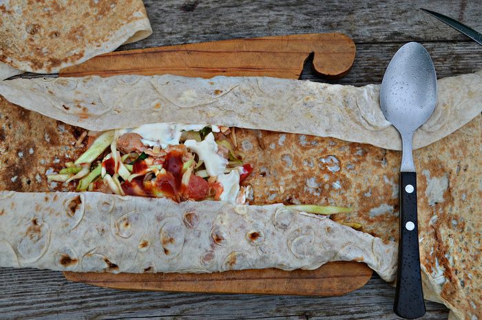 Лаваш разделить на кусочки, выложить на середину каждого начинку, добавить ваш любимый соус и свернуть. Тут же подогреть шаурму на решётке гриля и подавать к столу.