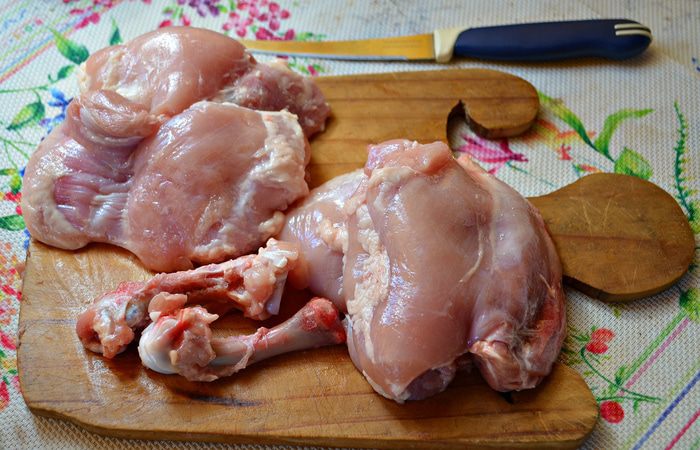 С куриных бёдрышек снять кожу и освободить мясо от костей.