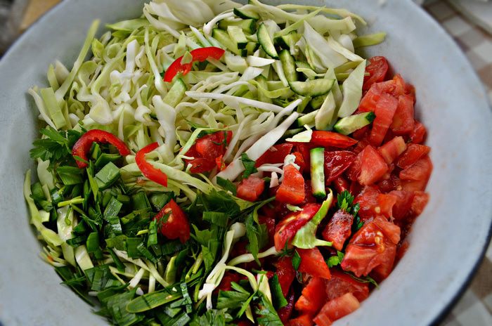 Тем временем капусту тонко нашинковать, огурец и болгарский перец нарезать соломкой, помидоры - кубиками, мелко порубить зелень, сыр натереть на крупной тёрке.