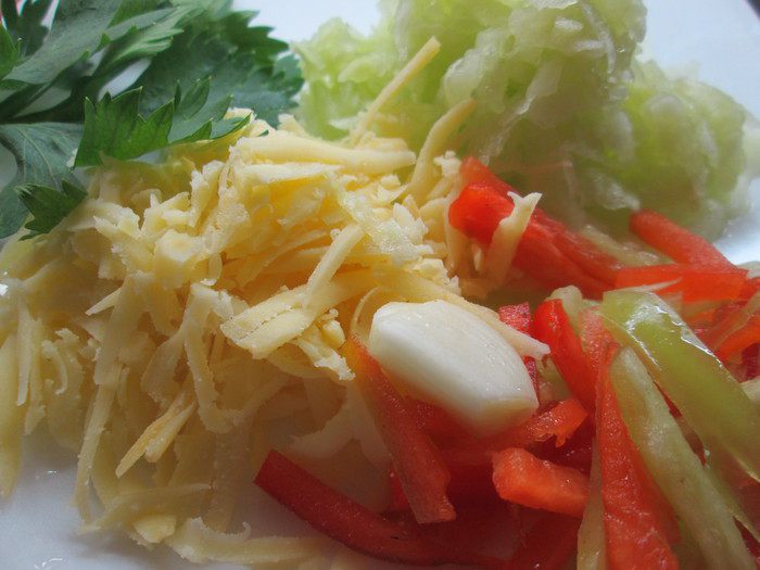 Натираем на крупной терке очищенные от кожицы огурцы и отжимаем сок. Перец режем мелкими ломтиками. Натираем сыр на крупной терке, мелко шинкуем чеснок.