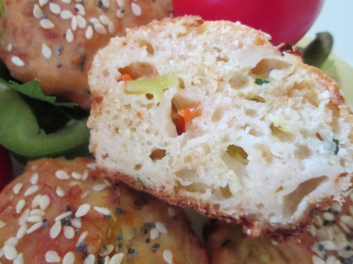 Добавляем к овощам взбитые яйца, йогурт, муку смешанную с содой, зелень, растительное масло, соль, сахар и замешиваем тесто.