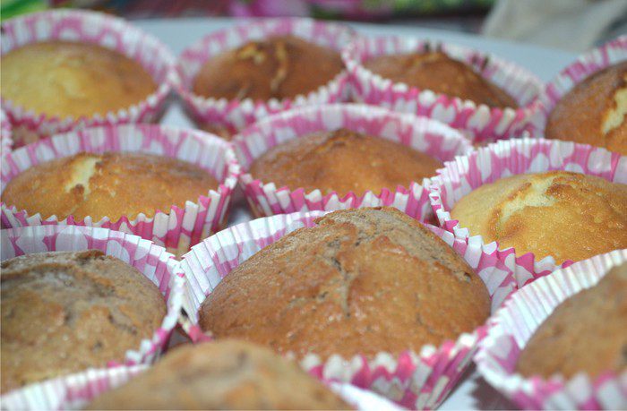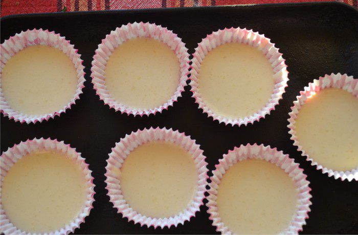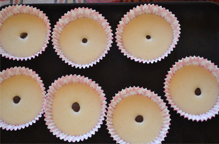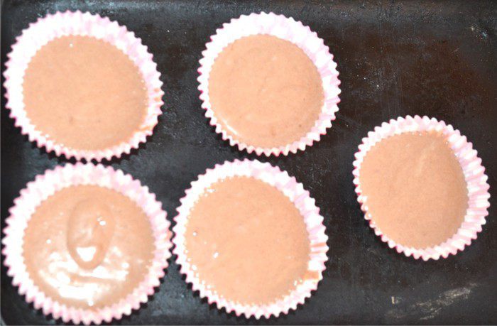 Начинаем выкладывать в формы наше тесто. Духовку разогреем до 180 градусов. Осторожно, чайной ложкой выкладываем тесто в бумажные формочки. Я решила сделать 3 вида капкейков. Одни просто ванильные.