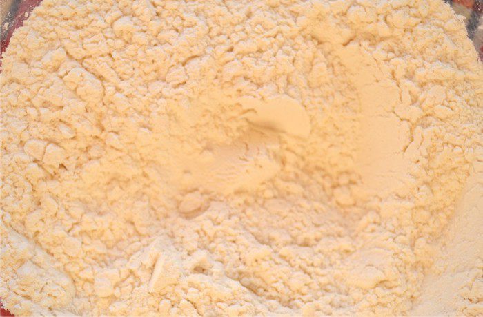 Через сито, просеивая, добавляем сухую смесь муки, соды, разрыхлителя и соли к жидкой части нашего теста. Все перемешиваем до однородного состояния. Оставляем на 15 минут отдыхать.