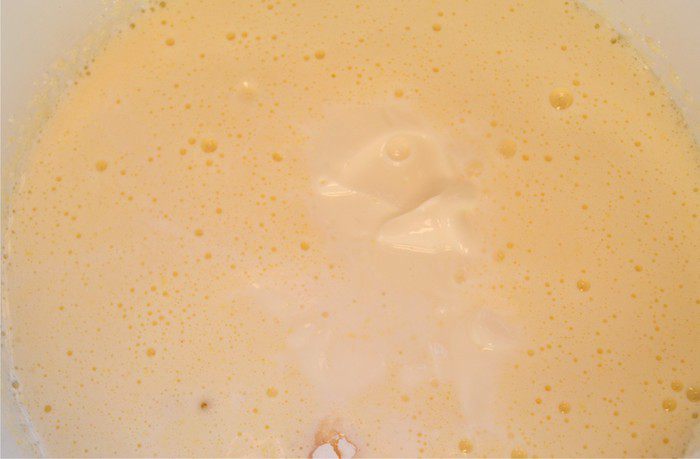 К яйцу и сахару добавляем все жидкие компоненты теста: сметану, молоко, остывшее масло. Все хорошо перемешиваем.