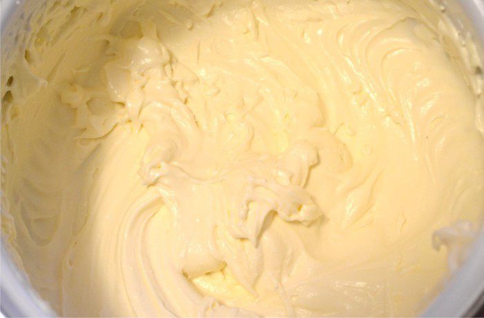 Приступаем к крему. Он простой, но очень удачный, вкусный, и как нельзя лучше подходит к бисквиту. Охлажденное масло взбиваем с сгущенным молоком. Крем должен быть очень пышным и держать форму.