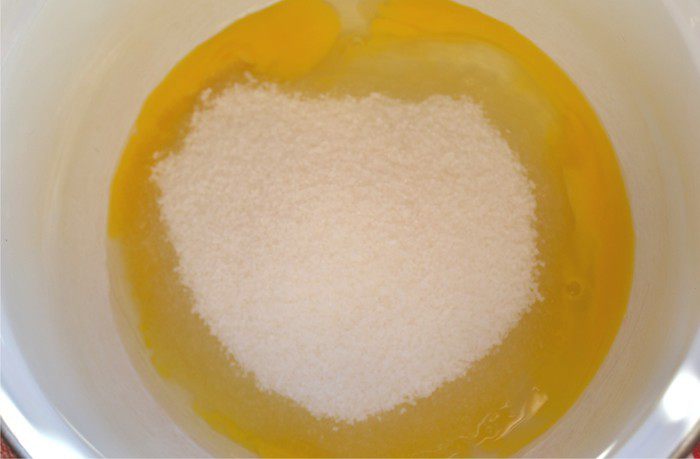 К яйцу добавляем сахар и хорошо взбиваем до белого цвета.