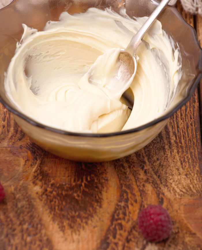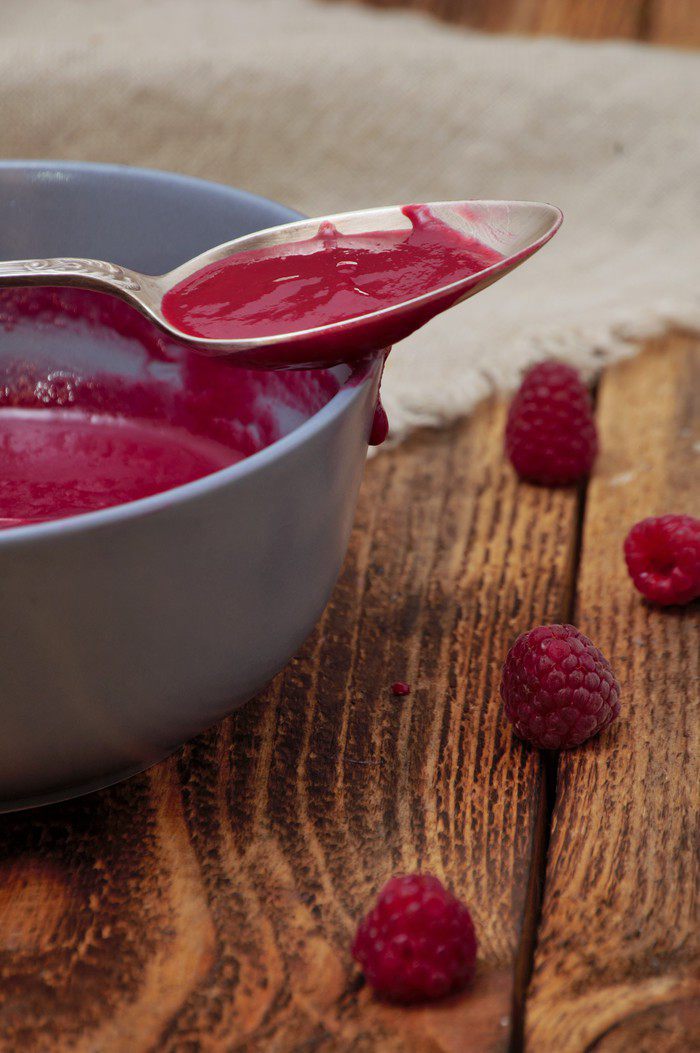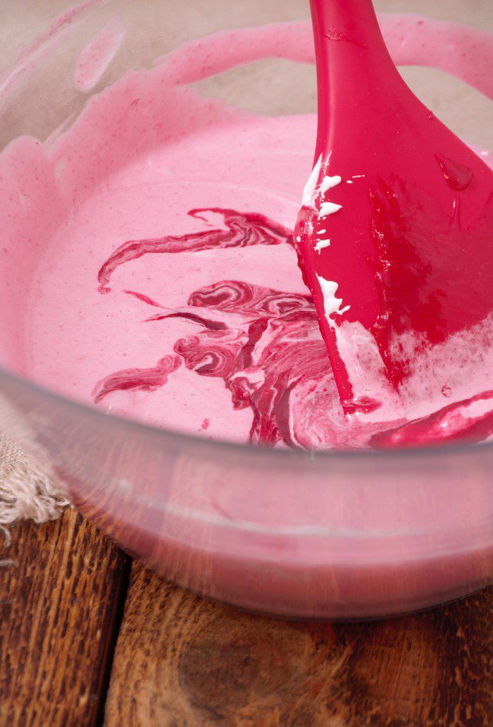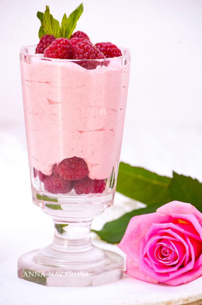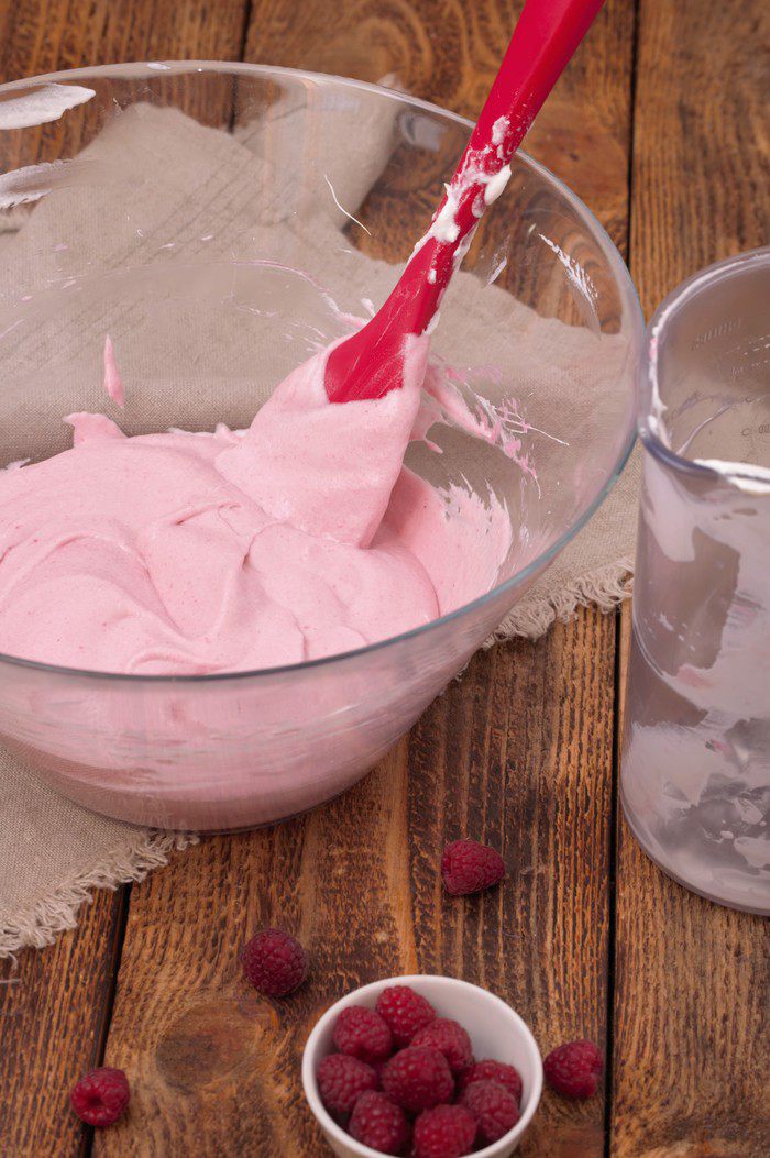 Соединить теплый шоколад и малиновое пюре. Очень важный момент: обе массы должны быть одинаковой температуры! Если пюре остынет и будет прохладным - шоколад свернется. Дабы этого не произошло - прогрейте пюре в микроволновке в режиме "разморозка" буквально 10 секунд, чтобы пюре стало тёплым. Частями введите шоколад в пюре, аккуратно размешивая ложкой. Добавьте розовую воду, перемешайте. После чего в эту же массу подмешайте распущенный и остывший до комнатной температуры желатин.