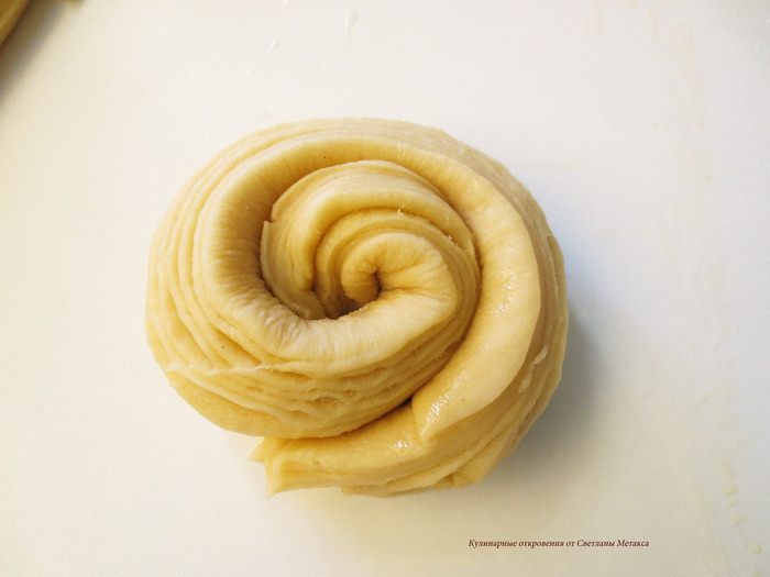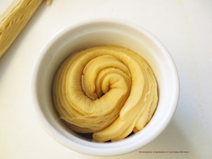Формочки, если они не силиконовые, смазать маслом. Свернуть полоски вот таким образом, чтобы разрезанная внутренняя часть полосок была наружу, тогда рисунок слоев в готовом изделии будет виден четче. А также можно полоски завязать в узел.