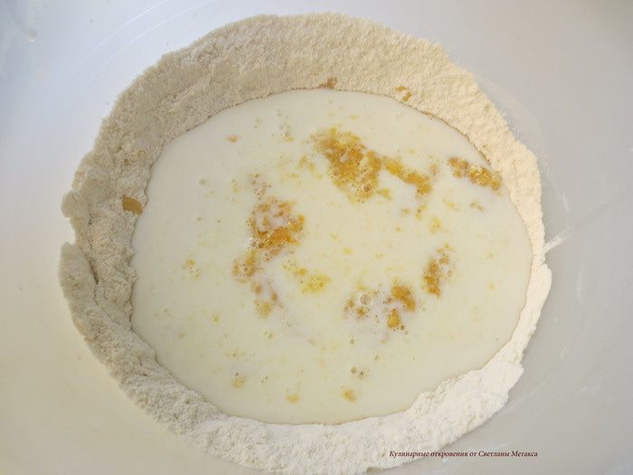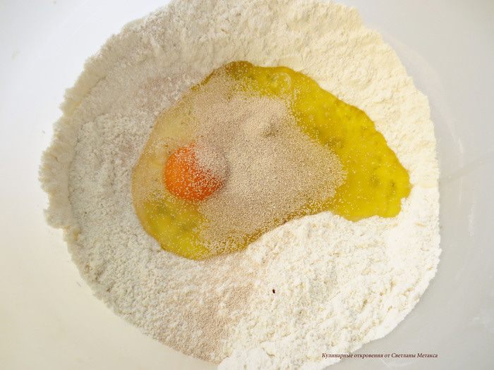 Сделать в середине углубление и добавить масло, яйцо, дрожжи. В оригинале рецепта яйцо не добавляют и масло используют сливочное. Его нарезают на кубики и добавляют в муку. Вы можете сделать как у меня или иначе.