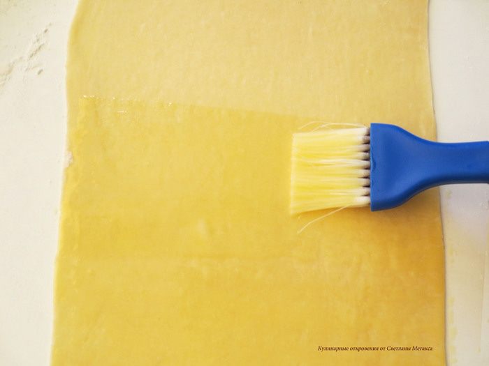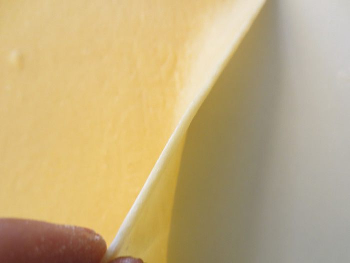 После этого я еще раскатывала. Ширина лепешки должна быть 25 см, длина 40-50 см, толщина 1.5 мм, а лучше тоньше.