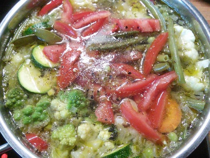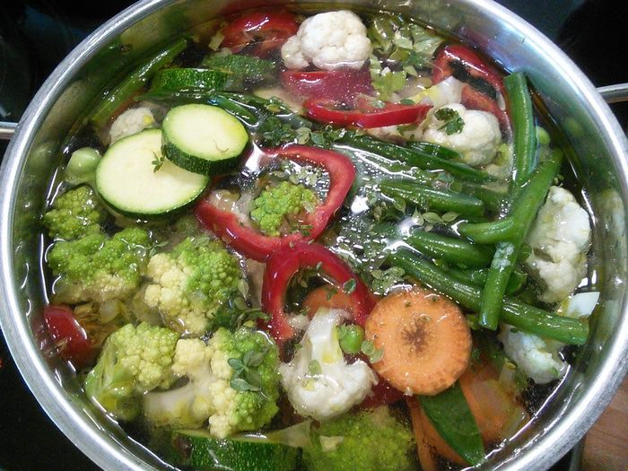 Залить бульоном, добавить овощи и медленно довести до кипения. Добавить листики тимьяна. Кастрюлю накрыть крышкой и варить суп на медленном огне 10-15 мин.