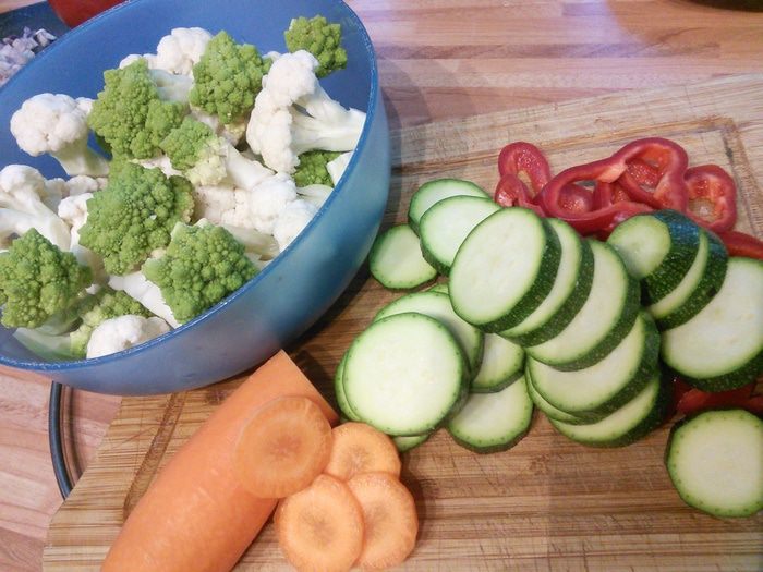 Помытые овощи подготовить: цветную капусту и романеско разобрать на соцветия, перец, цукини и морковь порезать кружочками. Сельдерей мелкими брусочками, фасоль разрезать пополам.