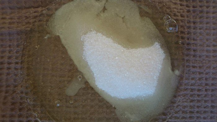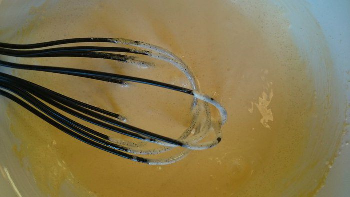Желтки с оставшимся сахаром растереть добела.