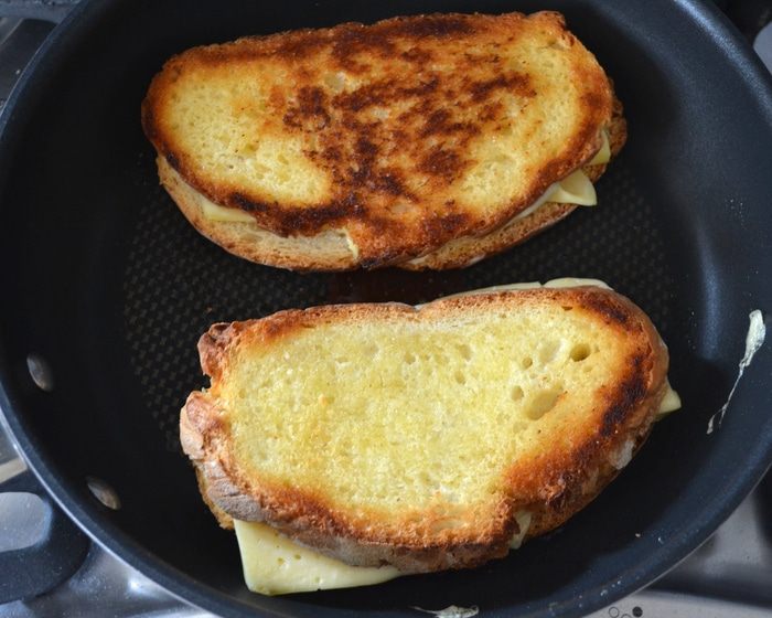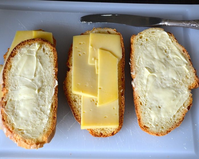 Итак, для этих гренок в отличие от традиционных на французский манер, берем свежий хлеб, не черствый! Из расчета на одну гренку - два ломтика хлеба. Сыр нарезаем. Каждый ломтик хлеба смазываем с ОДНОЙ стороны тонким слоем сливочного масла. Теперь берем один ломтик хлеба и выкладываем на него сыр на ту сторону, что без масла. Сверху накрываем вторым ломтиком (сторона без масла). Таким образом у нас получается вот такой "бутерброд" - внутри слой сыра, снаружи смазан с обеих сторон немного маслом.